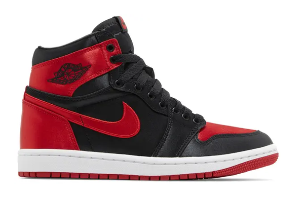 Unveiling the epitome of timeless design with the Jordan 1 Retro High OG Satin Bred (Women's) in the ever-classic Black/University Red/White colorway. The sophisticated satin finish adorns the iconic silhouette, exuding a blend of vintage charm and modern-day chic.