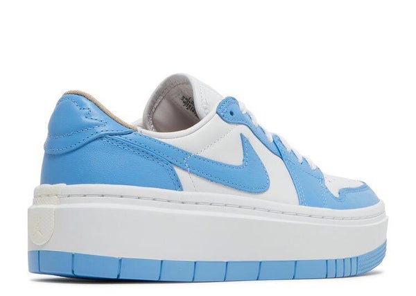 The Air Jordan 1 Elevate Low SE University Blue (W) features a white leather base with university blue overlays and Swooshes. The white leather extends to the tongue and liner, while underfoot, a modified chunky platform sole in white atop a uni blue rubber outsole with the outline of the Win(GS) for grade schoolers logo in the rear and cork insoles completes the design.