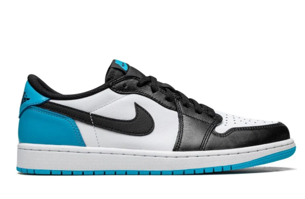 Paying homage to Michael Jordan's alma mater, this colorway of the Air Jordan 1 Retro Low OG features a simple and clean 'UNC' colorway. A full leather upper features a white base with black overlays on the forefoot and lace area, but a vivid Dark Powder Blue on the back heel area. A black Swoosh frames the profile, while a black Wings logo can be found on the back heel piece. A crisp white midsole gives way to a UNC rubber outsole, completing the look.