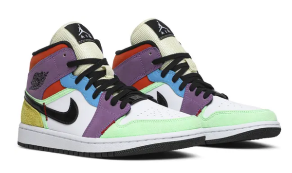 The women’s Air Jordan 1 Mid SE ‘Lightbulb’ showcases an array of mixed materials and hues on the upper. The design uses a white leather base, accented with patent leather detailing on the black Swoosh and blue eyestay. Suede paneling in green and yellow are applied to the toe and heel, while purple nubuck appears on the collar flap and forefoot overlay. Exposed zigzag stitching in contrasting red gives the shoe an unfinished look.