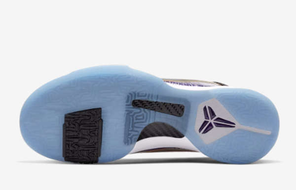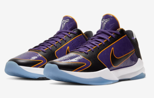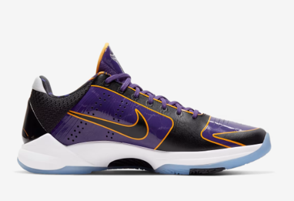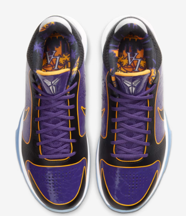 Kobe Bryant's commitment to the game on and off the court reflects the Mamba Mentality that drove him to become a five-time champion and one of the greatest athletes of his generation. The Zoom Kobe V Protro '5x Champ' reinterprets the championship-themed jackets gifted to Kobe after his second and third titles. The shoe retains its patent leather finish dressed in purple and black with gold accents. The Zoom Air unit and icy sole are complemented by an insole that features a "5-Star" graphic print.