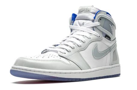 The Air Jordan 1 High Zoom “Racer Blue” adds upgraded cushioning and a sleek color scheme to Michael Jordan’s first signature shoe. The clean construction includes a perforated toe area done up in white leather that is contrasted by light grey patent leather overlays on the forefoot, eyelets, and heel. The collar, side Swooshes, and heel panel all feature a clear synthetic material. Blue accenting is found on the liner. A icy blue outsole with a red-to-blue gradient visible underneath completes the striking colorway. Release date: March 14, 2020.