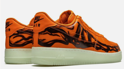 Drawing from a 2018 design, the Air Force 1 Low 'Orange Skeleton' released in October 2020 with a look fit for the fall holiday. The shoe's upper is built with leather, finished in Starfish and highlighted by a skeletal foot across the side wall. Perforations on the toe box provide breathability, while the custom sockliner includes a top-down skeletal view. Underfoot, the semitranslucent rubber sole unit includes Air for cushioning and a glow-in-the-dark finish.