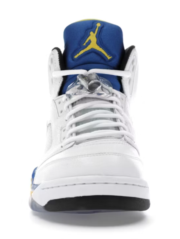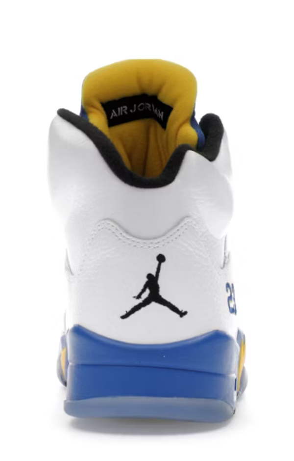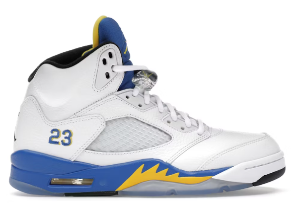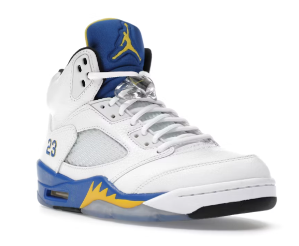 The Jordan 5 Retro Laney (2013) is a high-top shoe featuring a white leather top highlighted by Royal Blue and Varsity Maize.