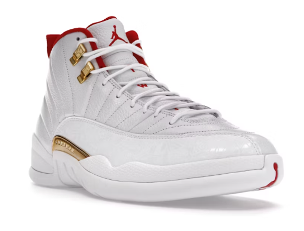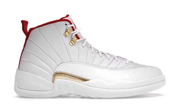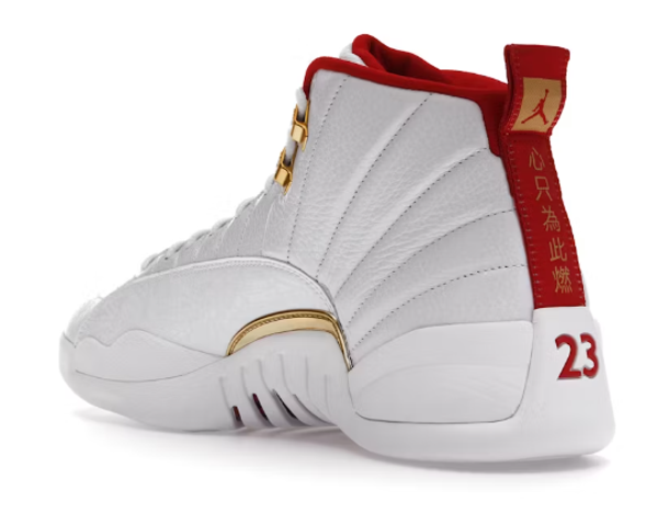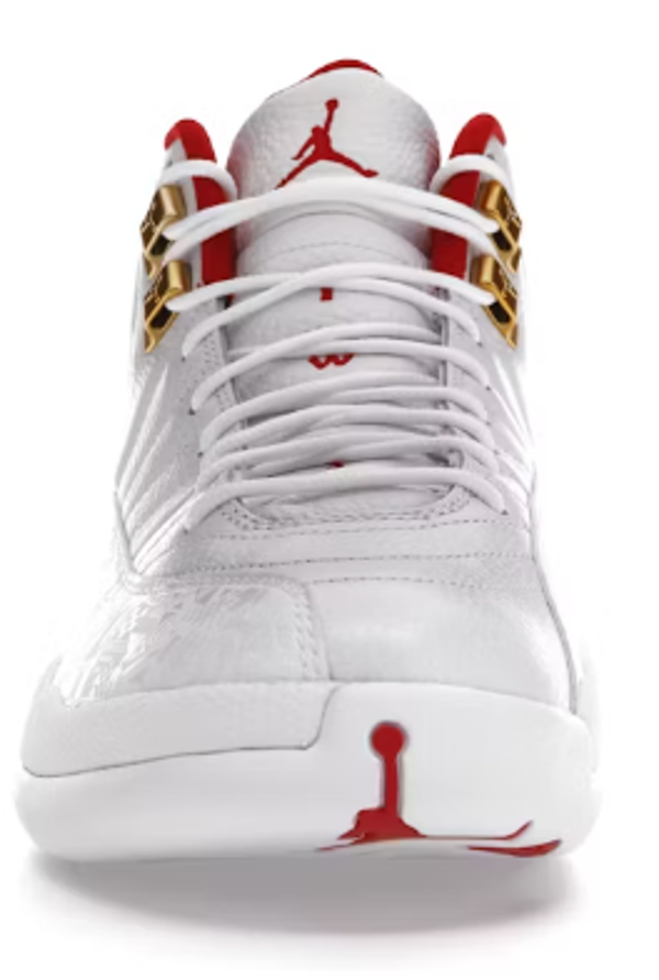 This AJ 12 is reminiscent of the existing "Rising Sun" colorway except it differs by displaying red detailing with gold accents. This design features a white leather upper detailed with different symbols from flags. Chinese text on the heel tab and the signature "TWO 3" embroidery on the tongue completes the design. These sneakers released in August of 2019 and retailed for $190.