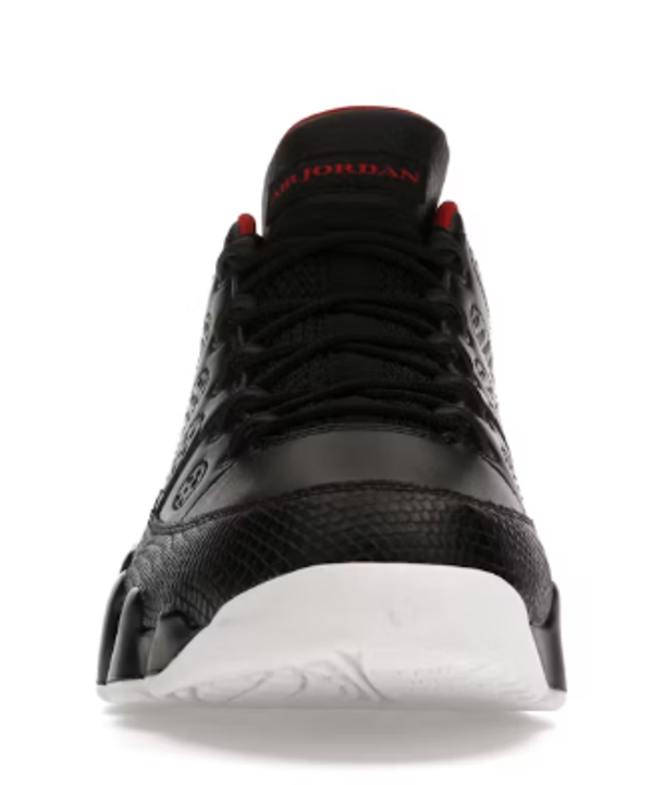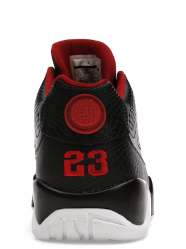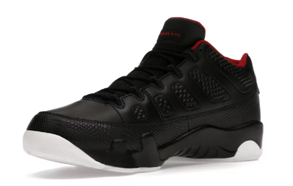 The Jordan 9 Retro Low Snakeskin is a part of the Jordan Retro series. The shoe comes in a predominantly black color with Gym Red and white accents.
