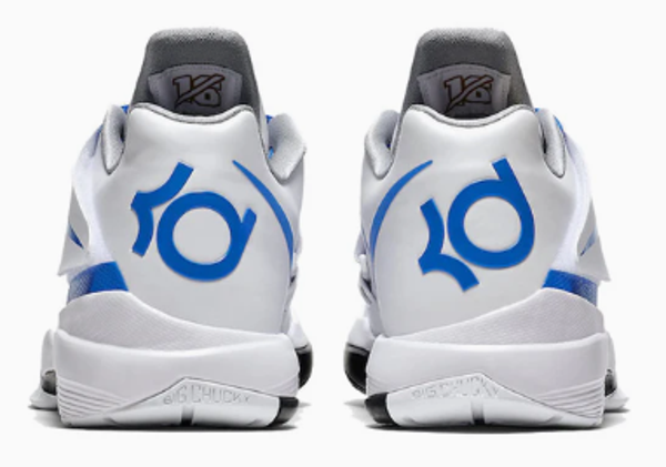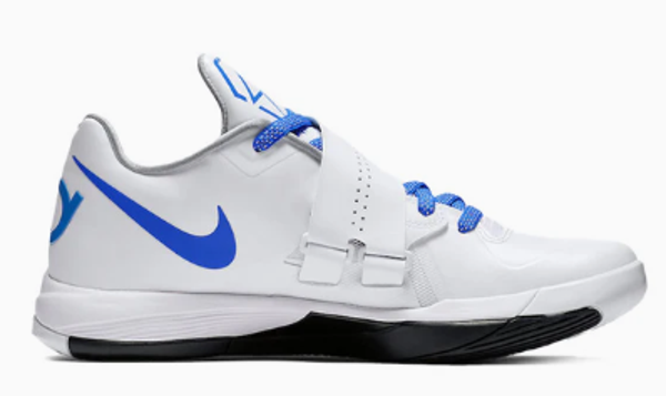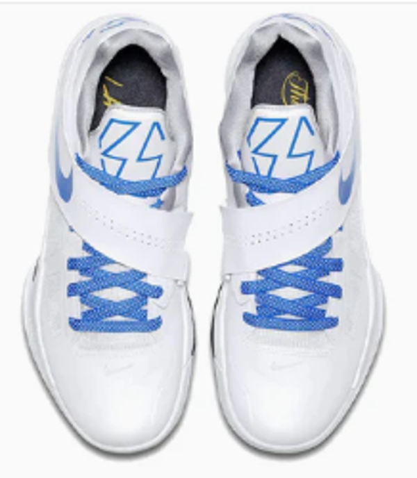 The Nike Zoom KD 4 'Battle Tested' pays homage to Game 6 of the Western Conference Finals when KD took over to help the Thunder close an 18-point deficit after half-time, eventually going on to appear in his first NBA Finals. Appearing with the classic white and blue makeup, key details like the NBA Finals patch are printed on the insoles, while additional features include the number 16 on the tongue and a gold coated trophy hang tag.