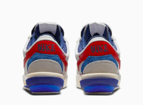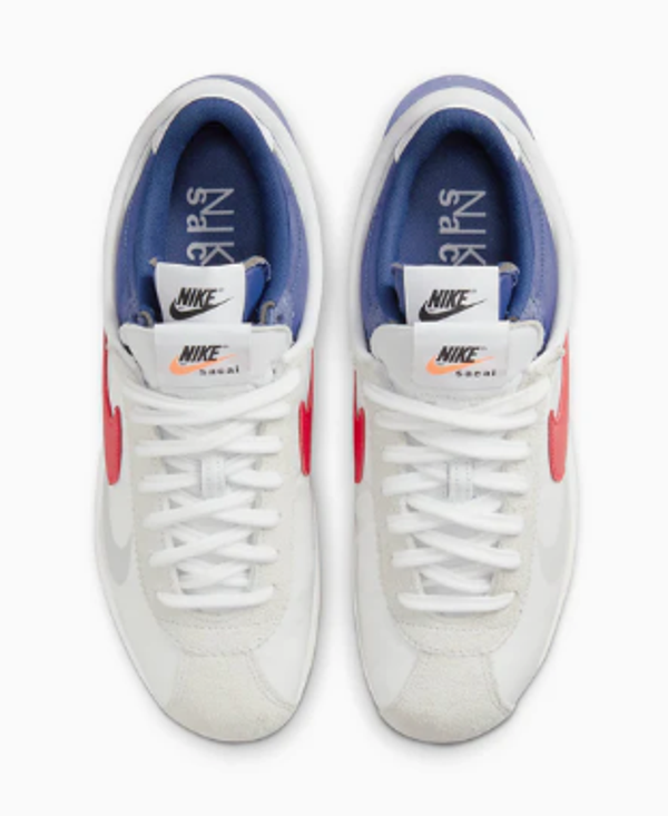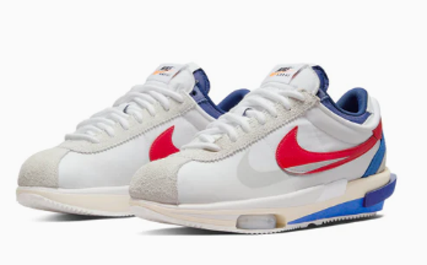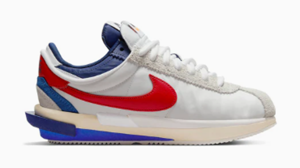 Presented with a modern twist by designer Chitose Abe, the sacai x Nike Zoom Cortez SP 'OG' marks the 50th anniversary of the classic running shoe. The unique double-themed design is back, featuring a white nylon upper with a second collar and tongue in navy. The retro leather Swoosh and the heel tab with both brand logos are red, while stacked layers in royal blue and gray suede give the shoe depth. The foam midsole is updated with a raised heel piece and exposed Zoom Air cushioning at the front.