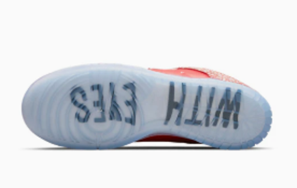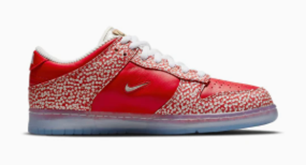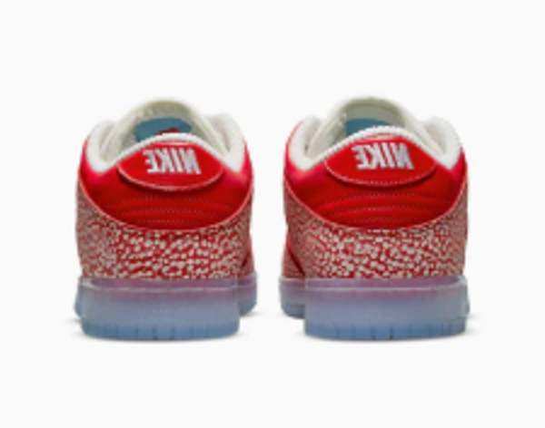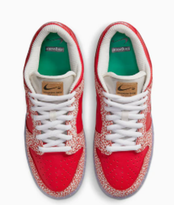 The Stingwater x Dunk Low SB 'Magic Mushroom' is the result of a collaboration with Daniel Kim's skate brand. The shoe's upper is built with leather, with the University Red base highlighted by a safari print on the overlays, creating a design not unlike a mushroom cap. The lateral quarter panel includes a jewel Swoosh and scrambled Stingwater branding, while the heel patch includes reverse Nike branding. A zippered stash pocket on the tongue is joined by an interior woven tag that reads 'Free Your Mind,' while underfoot, the translucent rubber outsole reveals 'Plant Emoji' and 'With Eyes' across both shoes.