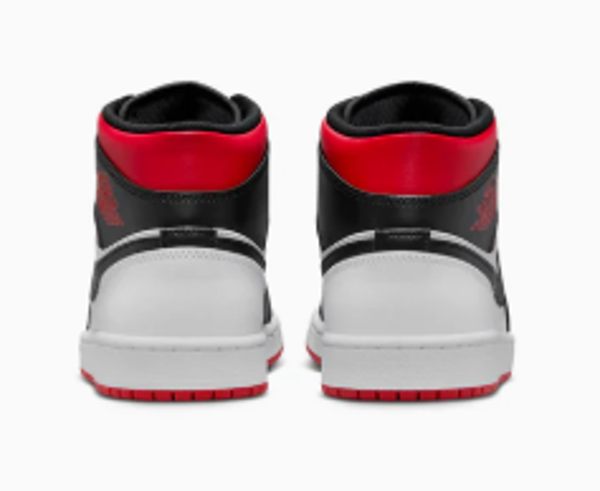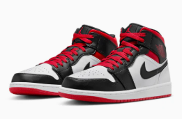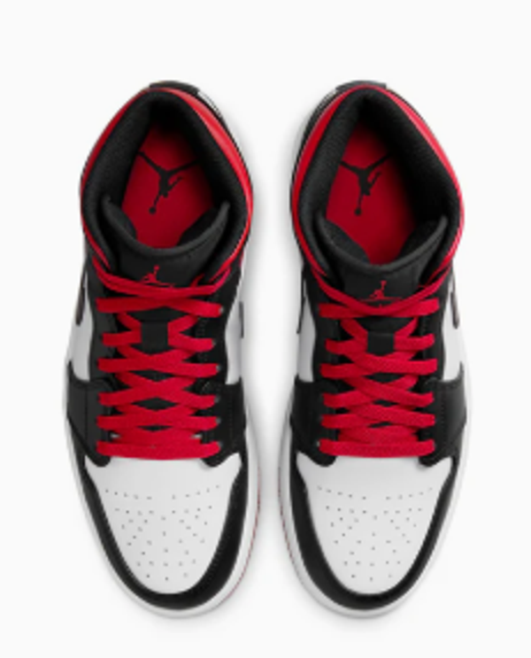 Appearing in a classic Jordan Brand colorway, the Air Jordan 1 Mid 'Black Gym Red' released in May 2021. Built with leather, the shoe's upper sports a white base, contrasted by black on the overlays and highlighted by Gym Red on the padded collar, 'Wings' logo and Swoosh branding. A breathable nylon tongue and perforated toe box support the fit, while underfoot, a standard rubber cupsole with Air in the heel anchors the build.