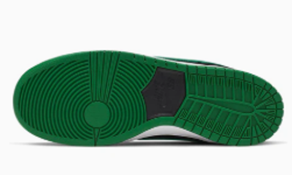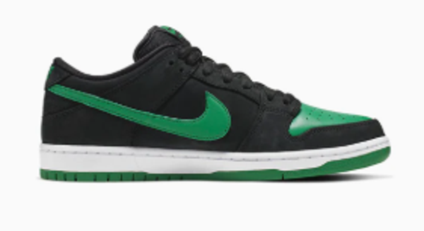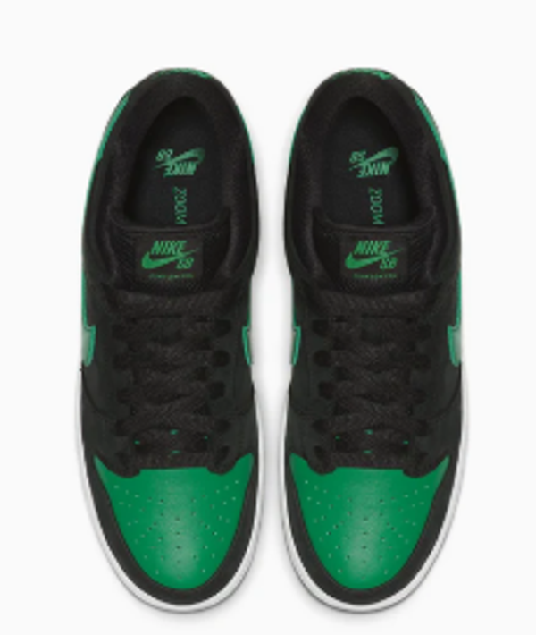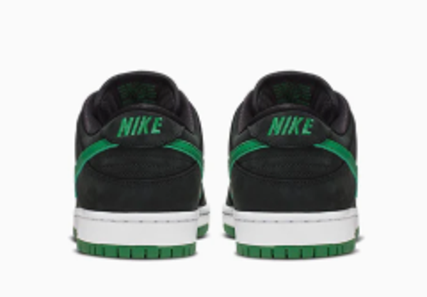 The Dunk Low Pro SB 'Black Pine' released in June 2019 with a look similar to the Nike SB J-Pack series. The shoe's upper is built with a black suede base, with Pine Green leather on the Swoosh and perforated toe box, with the color also on the heel patch and tongue tag. Underfoot, the white midsole includes Zoom Air in the heel for cushioning, giving way to a Pine Green rubber outsole for traction.